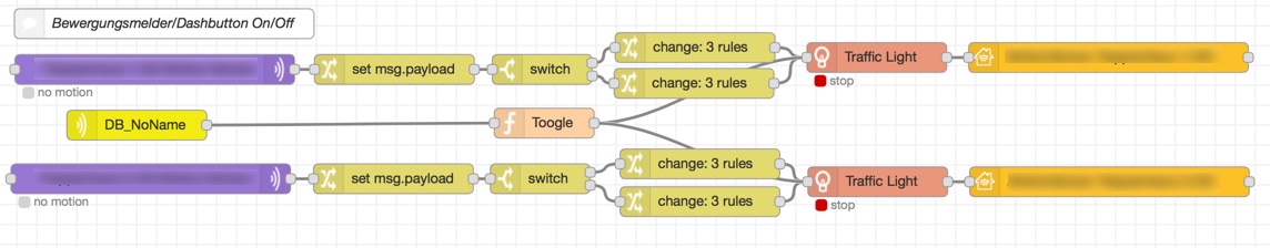 Ich habe nun nach einer Lösung gesucht wie ich die Notification via Hardware Ein- und Ausschalten kann, hierzu ziehe ich wieder den Amazon Dash Button heran. Mit diesem schalte ich eine Funktion die wiederum die „Ampel“ in Node-Red auf „Allow“ oder „Stop“ stellt. Das Bewegungsereignis wird also trotzdem verarbeitet nur nicht an das Home-Kit weitergegeben. Die Ampel hätte man auch vor den Switch direkt hinter den Bewegungsmelder setzen können. Die Funktion wäre gleich ;)